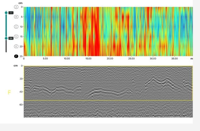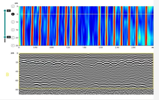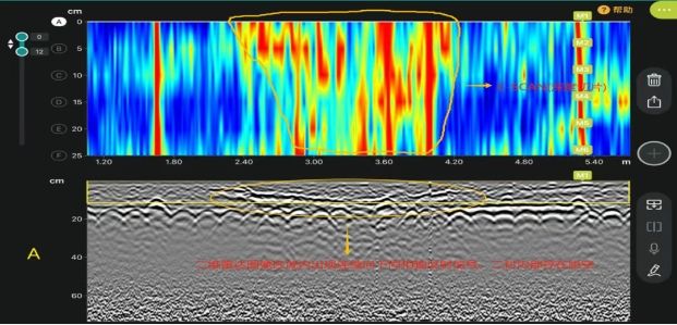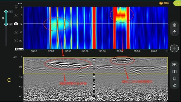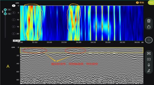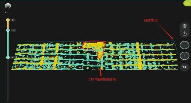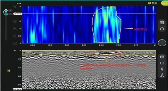 经检测,该区域存在3处脱空,通过深度切片视图,可直观观察到它们的具体位置。