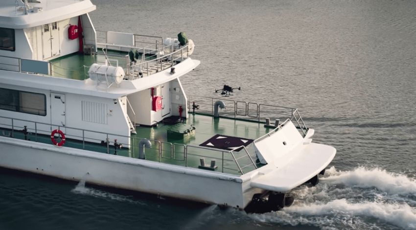 以蓬勃发展的海事领域为例,船舶巡航对于维护海洋秩序、保障海上安全至关重要。无人机凭借小巧的体积能突破地形和水域条件限制,在狭窄内河航道或复杂港口区域自由穿梭,快速抵达目标区域。空中作业的优势加上较低的购置和运行成本,使得海事行业对无人机的需求迅猛增长,然而,甲板空间狭小、船体晃动等因素却限制了无人机随船使用。针对海上风机巡检、海事巡查等水上作业需求,Matrice 400 研发团队经过研究和测试,成功新增无人机船上起降功能,无人机通过辨认船板上的降落点图案,可支持动态船舶降落,成功解决了船艇上无人机作业的起降难题。